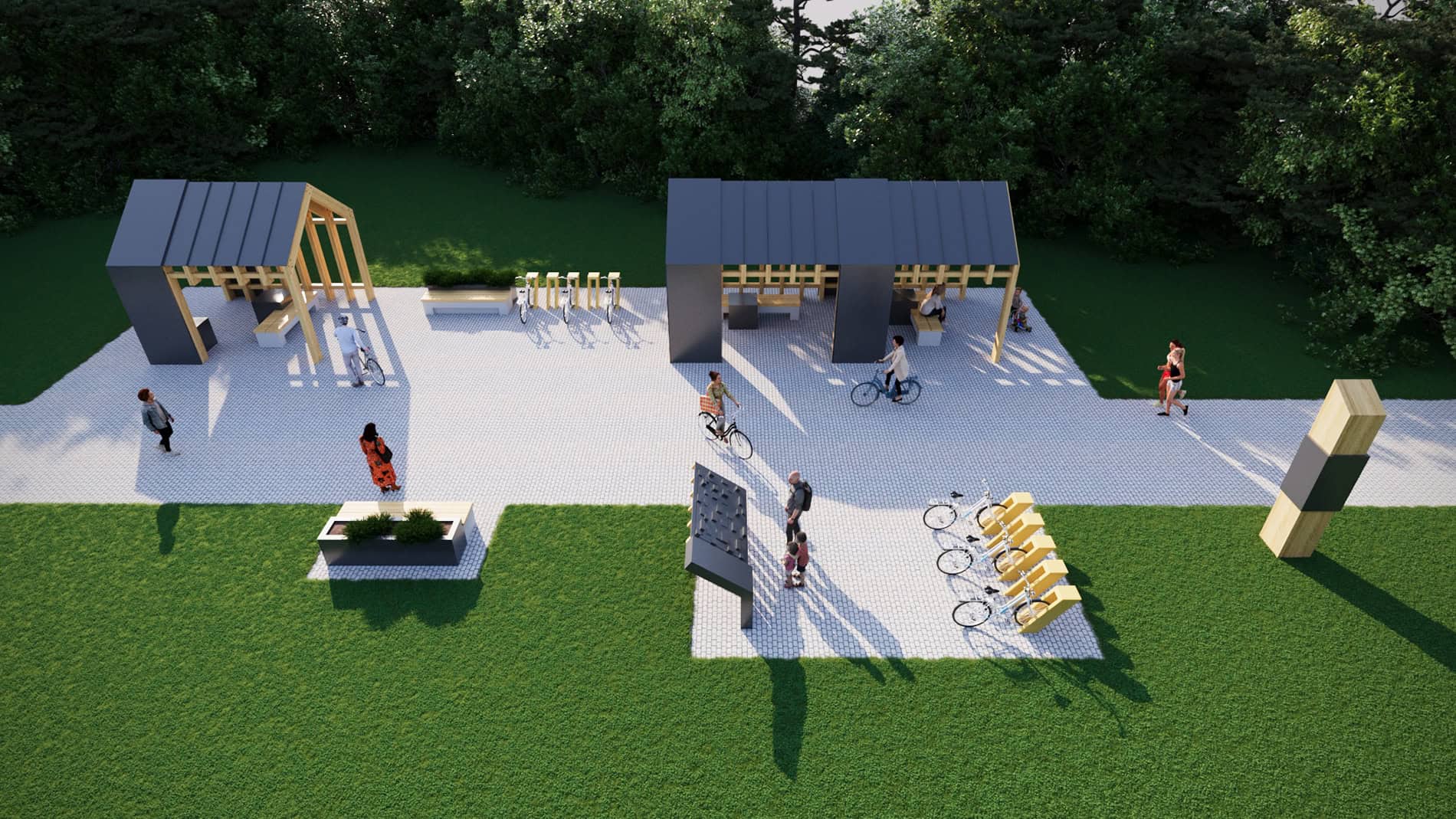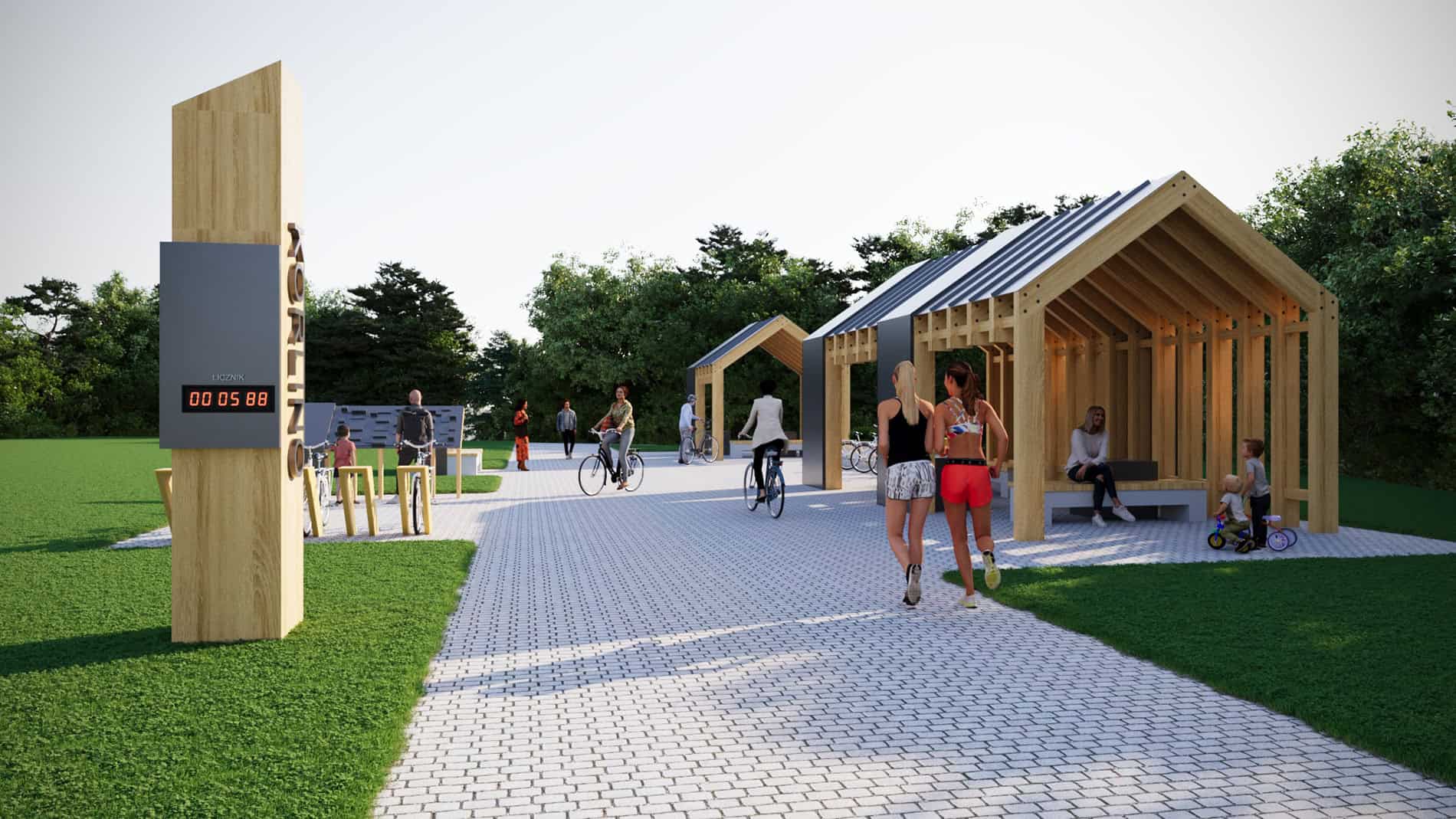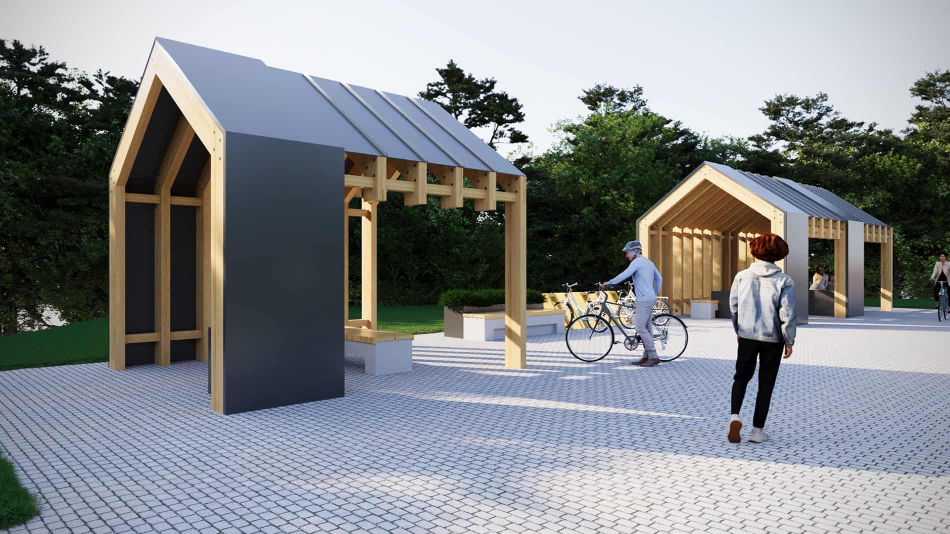 Przystanek rowerowy łączący piękno architektury i ciepło naturalnego drewna to miejsce, gdzie design spotyka się z funkcjonalnością– tu rodziny i rowerzyści mogą odpocząć i zadbać o swoje sprawy.