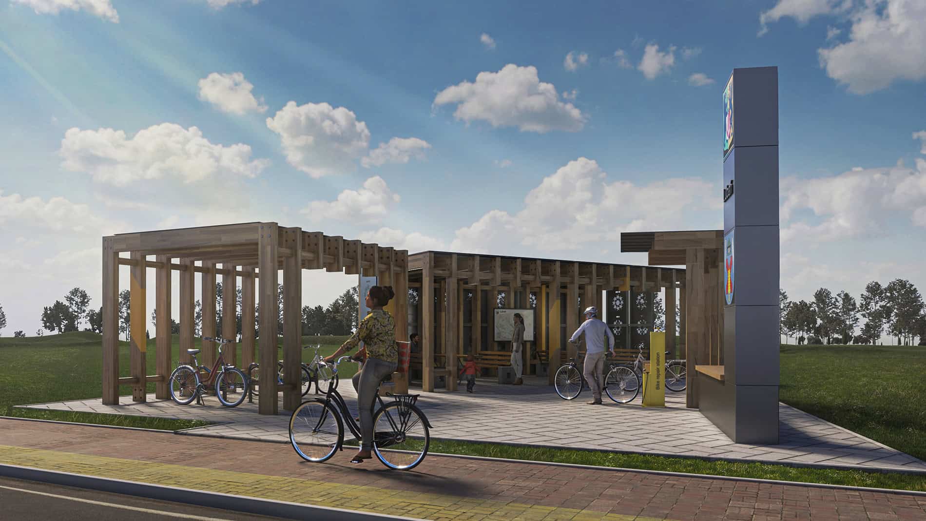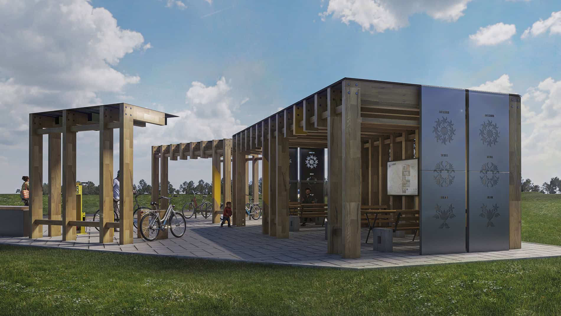 Przystanek rowerowy łączący piękno architektury i ciepło naturalnego drewna to miejsce, gdzie design spotyka się z funkcjonalnością– tu rodziny i rowerzyści mogą odpocząć i zadbać o swoje sprawy.